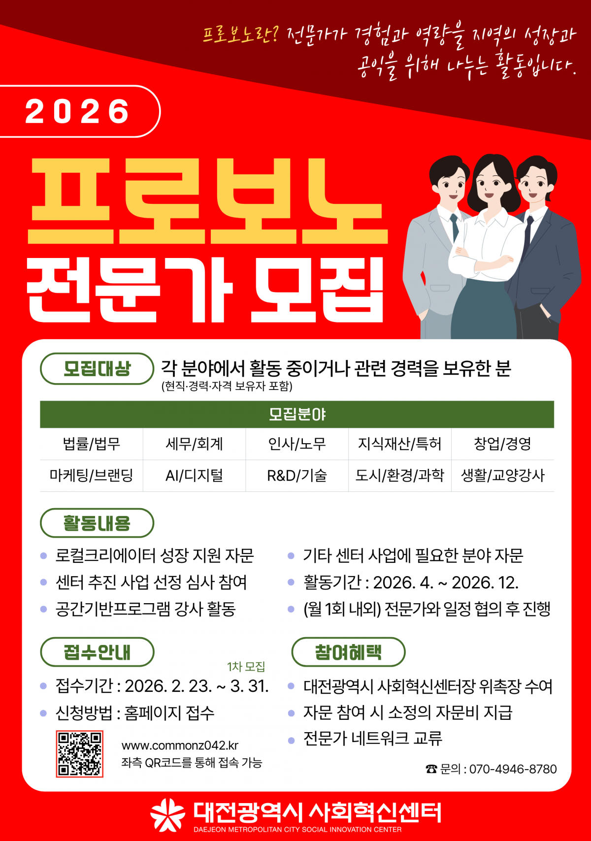 2026 프로보노 전문가 POOL 모집 공고 페이지 정보 작성자대전사회혁신센터 | 작성일2026-02-23 14:20:52 list_alt목록 본문 첨부파일 프로보노 전문가 POOL 모집 공고.pdf (245.2K) 8회 다운로드 | DATE : 2026-02-23 14:20:52 프로보노 전문가 POOL 신청서류서식 1~3.hwp (38.5K) 9회 다운로드 | DATE : 2026-02-23 14:20:52 이전글 2026년 커먼즈필드 대전 복도갤러리 전시 초대전 선정결과 공고 다음글2026 대전지역 예비초기 창업자 지원사업 참여자 모집 공고(로컬크리에이터 지원사업)