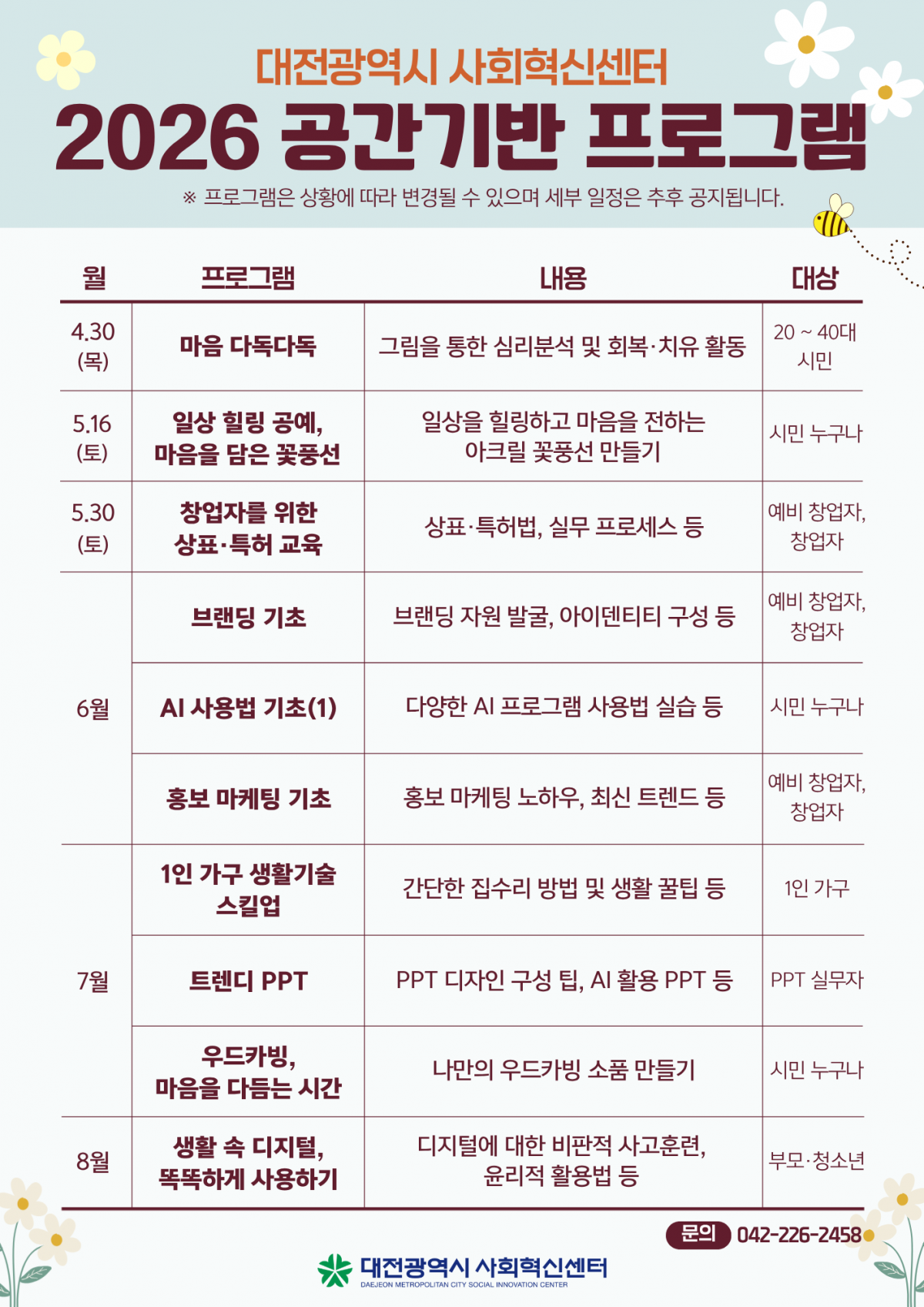 2026년 8월까지 진행 예정인 공간기반 프로그램을 안내 드립니다.